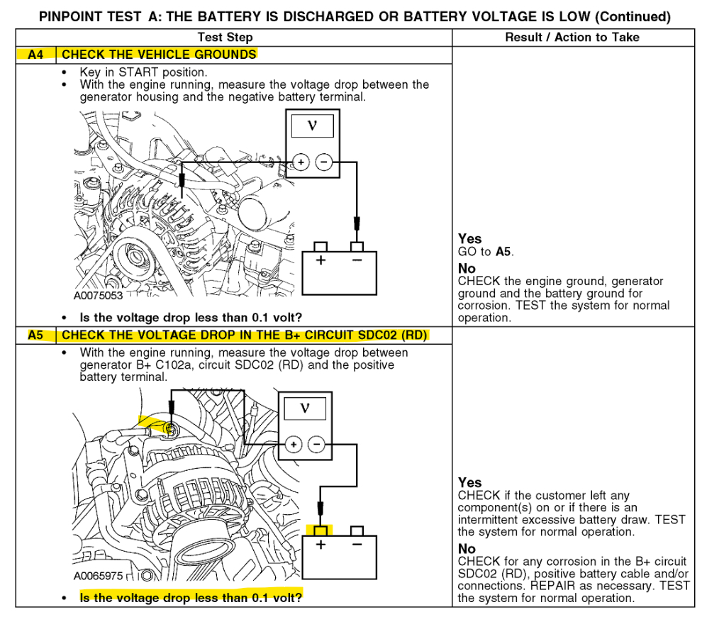The 2nd diagram below explains the voltage drop testing for the positive side and ground side from the Alternator case