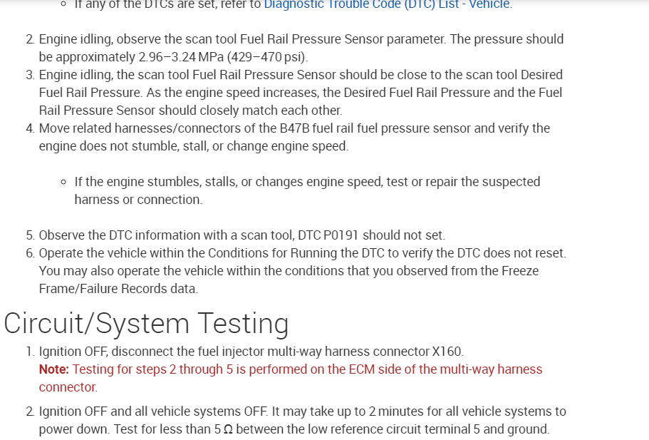 I changed out the high pressure fuel pump, replaced the fuel pressure sensor, and noticed the wiring harness to the pressure sensor was damaged. I replaced the harness to the pressure sensor (only) (not the whole injector harness)using the recommended wire crimps from the dealership. I replaced the fuel line leading in to the high pressure fuel pump as recommended from dealership.