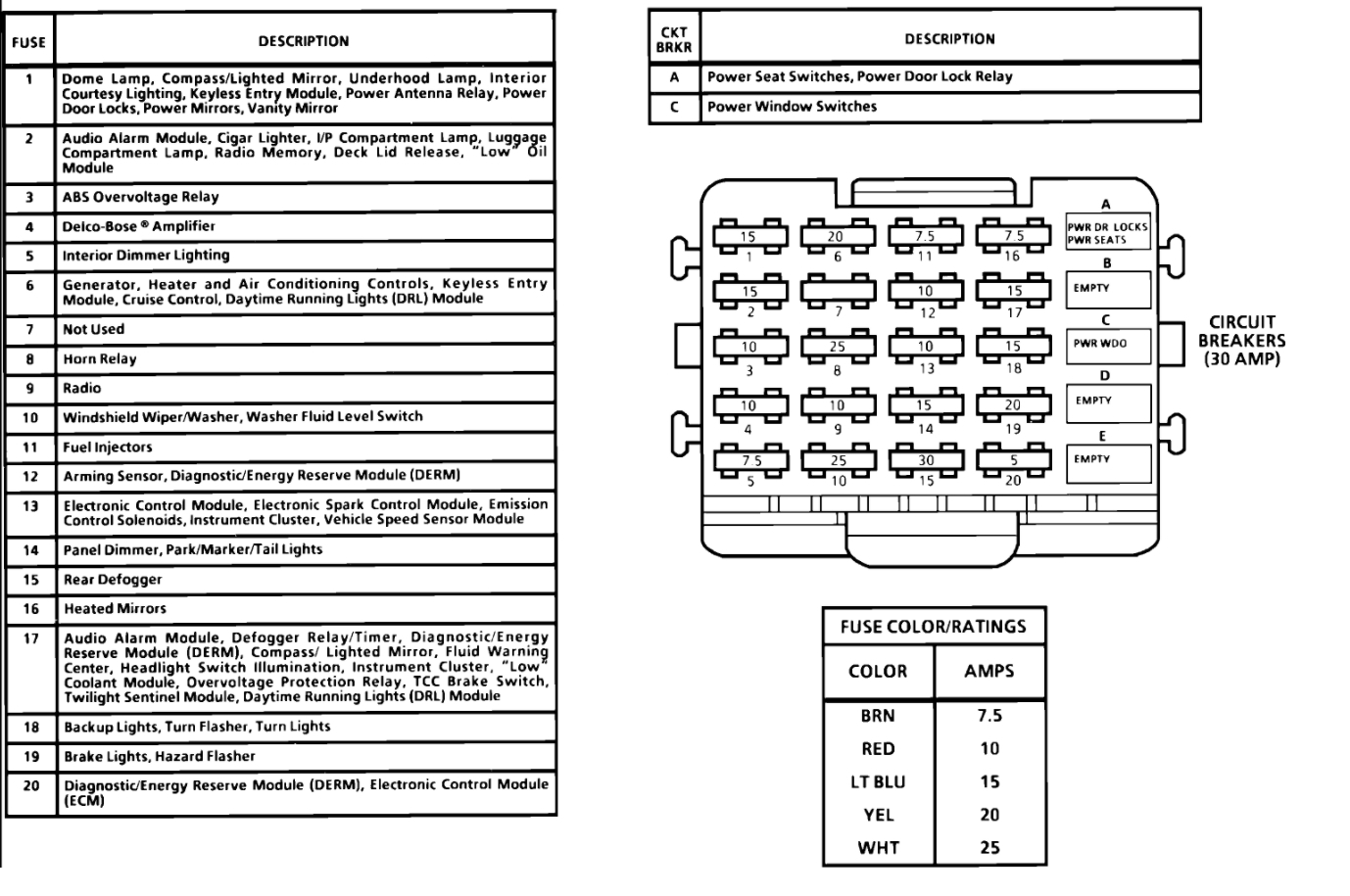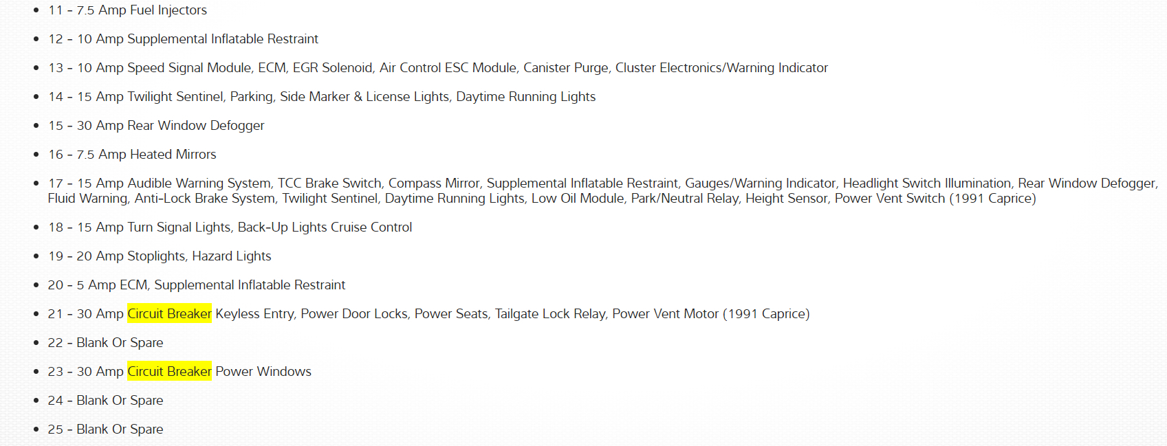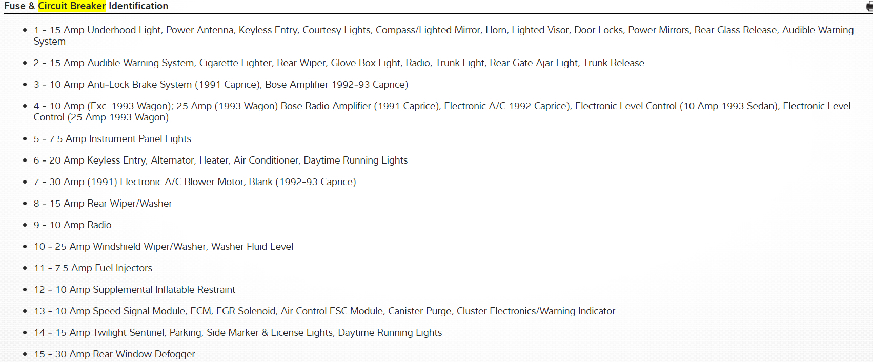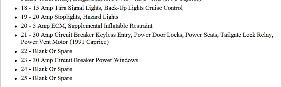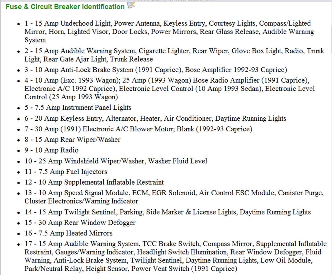17 - 15 Amp Audible Warning System, TCC Brake Switch, Compass Mirror, Supplemental Inflatable Restraint, Gauges/Warning Indicator, Headlight Switch Illumination, Rear Window Defogger, Fluid Warning, Anti-Lock Brake System, Twilight Sentinel, Daytime Running Lights, Low Oil Module, Park/Neutral Relay, Height Sensor, Power Vent Switch (1991 Caprice)