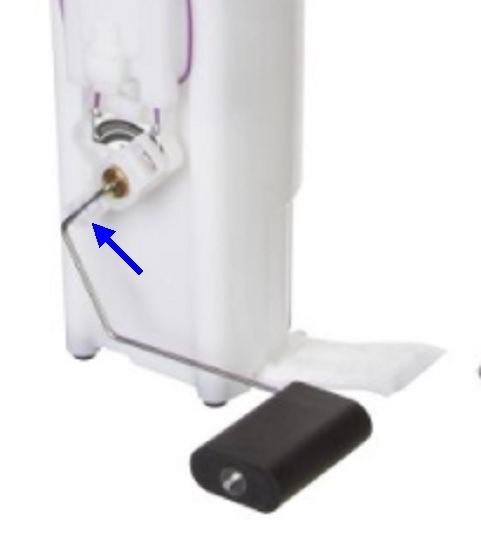 The photo shows what the assembly looks like on the side of the fuel pump housing. There should be a plastic clip to unsnap from the float arm, (blue arrow), and a way to pull the arm away so you can bend the movable contact slightly so it makes better contact.