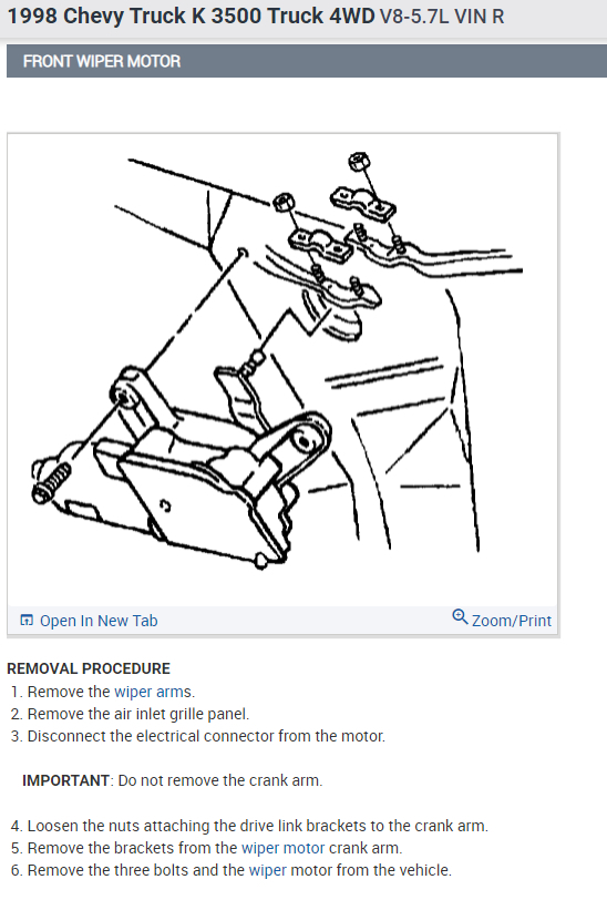 Trying to remove and install new wiper motor on my 1998 chevy 1 ton crew cab. I believe it is built on a suburban classy. I can't get the cowling off! I have removed the screws on both ends but there seems to be two tabs of some sort still holding it down and I can't figure out how to make them release. I know it can't be that difficult because windshield installers do it several times a day. Thanks for any suggestions or instructions, Nick