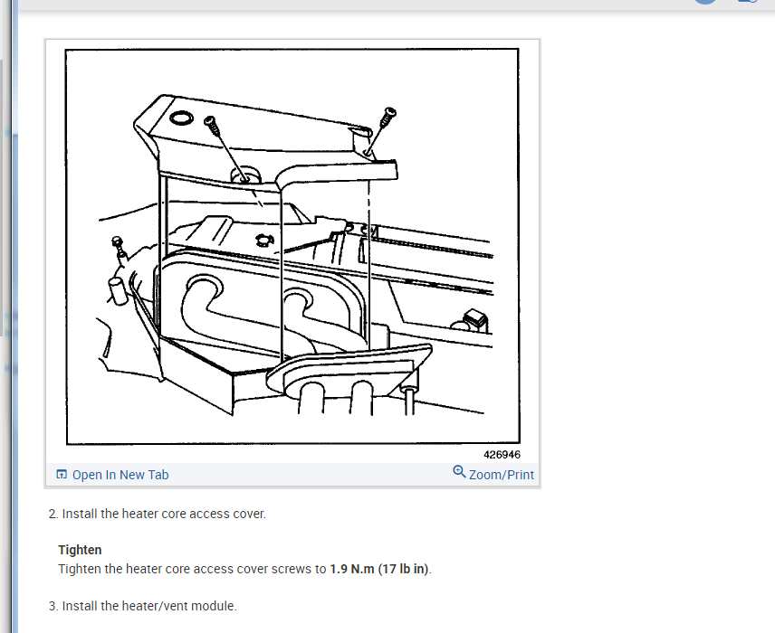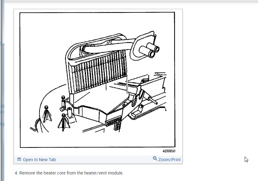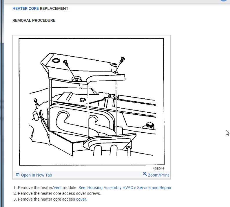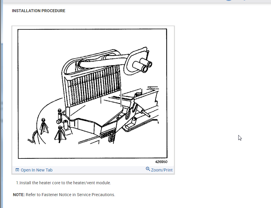 I am attaching the process from the manual on how to remove and install the heater core from the HVAC housing.