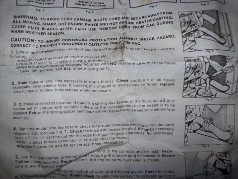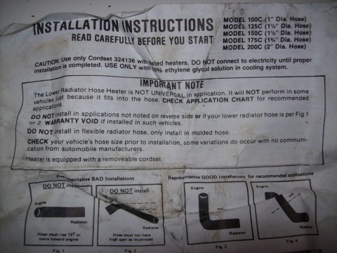 I'm sure you are probably familiar with this or something similar.....ex-girlfriends '82 mustang 2oo 6 cylinder was very cold natured.......i fell into this at a yard sale for $5 still boxed up. It installs on the lower radiator hose as close to the radiator as possible.......warm water rises!
