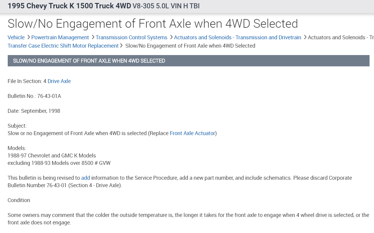 On My 1995 Chevy 1500 4WD the transfer case will not shift from 2WD to 4WD. The shift lever on the side of the transfer case seems stuck and won't buge. The shift linkage connected to the shift lever appears to be free to move. I would appreiciate any help I can get with this problem. Thanks!