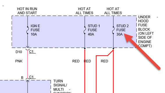 I cannot get power to the constant hot wire to my 7 way in the rear plug. Is the stud #1 supposed to have the 40 amp fuse. I have all of the turn and stop lights working at the plug and all of the other fuses seem to be good. I have a separate trailer brake control unit wired and plugged in under the dash and have used trailer with electric brake with no problems. I just wonder why i don't have the constant power to the rear plug.