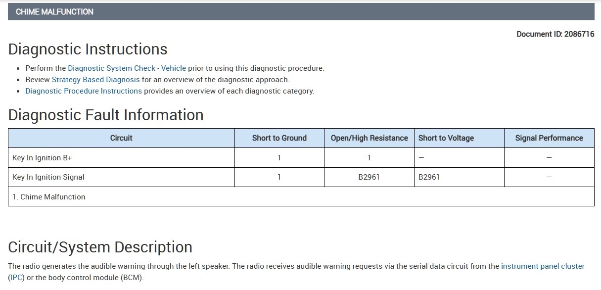 This is the service info for a "Chime Malfunction". But to begin with I would go through with a test light and check every fuse in the vehicle. Engine compartment fuse box and the one under the dash with the key On, see if you have a blown fuse.