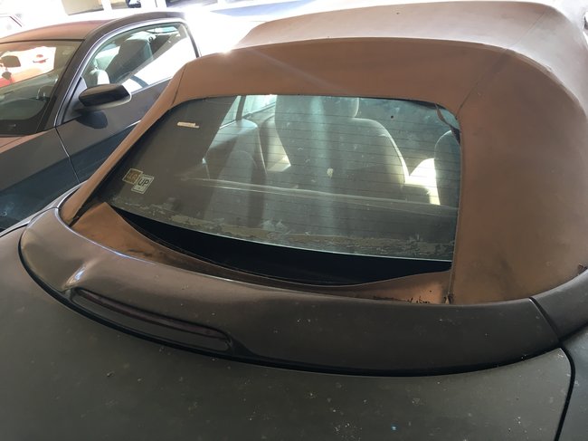 The convertible fabric attached to the trunk is not latched anymore to the rear glass. That creates a huge gap between the rear glass and (shrunk) convertible fabric. I'm trying to figure out how to latch them together so that my car is not dumped with rain water.