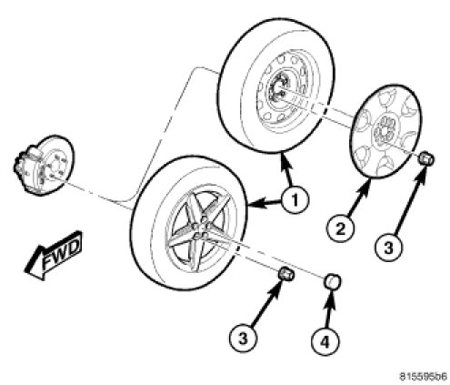 2. Remove the wheel mounting nuts (3), then the tire and wheel assembly (1).