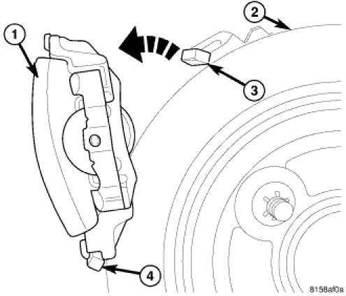 4. Remove the caliper assembly (1) from the brake adapter by first rotating the top of the caliper away from the rotor (2), and then lifting the caliper assembly off the lower machined abutment (4) on the adapter.