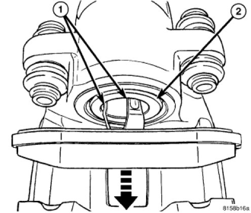 7. Pull the inboard brake pad away from caliper piston until the retaining clip (1) is free from the cavity in the piston (2). Remove the pad.