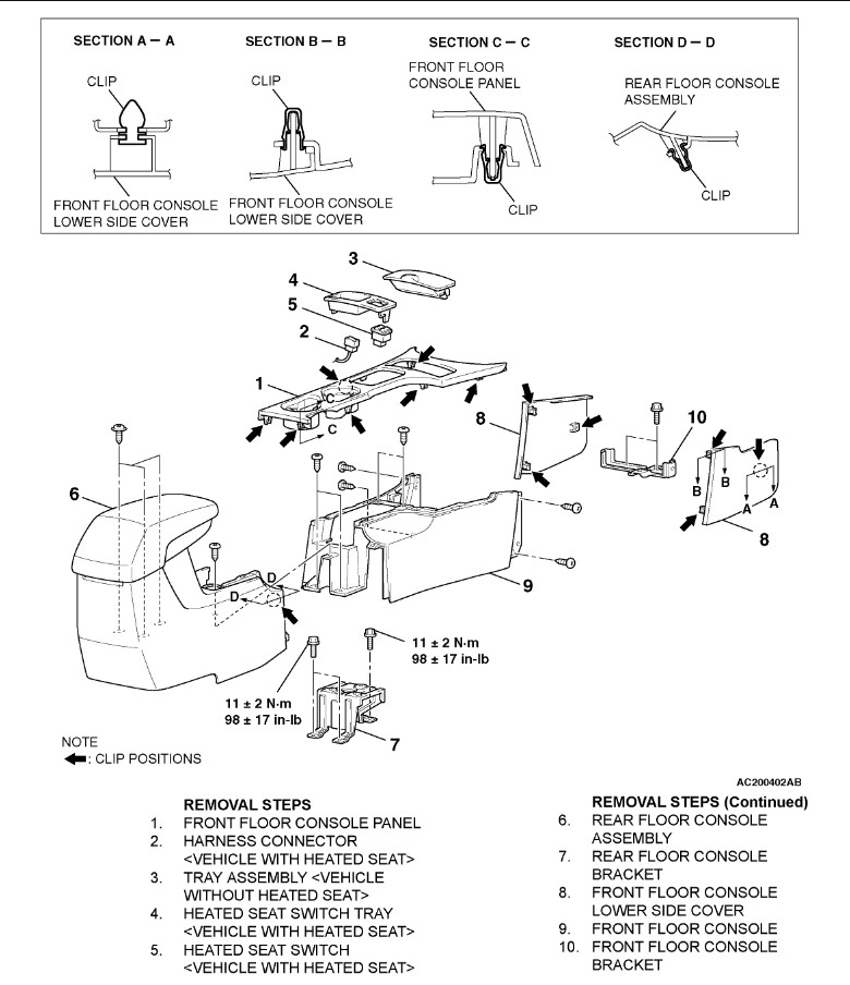 Take a look at the images I attached. Those include the instructions to remove the console's top cover and the center stack. It should be all clips if I recall and the instructions show the locations with the dark arrows.