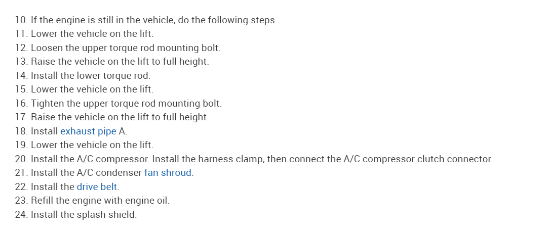 Hello, yes on these the A/C compressor needs to be unbolted but not the hoses. Just the electrical plug for it and move it out of the way. Exhaust pipe A needs to be removed, that's the section in the way. I'll post the instructions for removal and installation. These are difficult ones to do on the ground. The first diagram is steps 1 to 12. Step 14 is not there, as it's for automatic transmission.