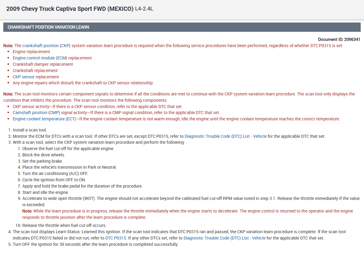 Hello, this is the only Captiva we have listed in All Data here. It's a 2.4 liter non turbo engine, and it shows the instructions for the Crankshaft sensor Variation Learn procedure, take note of the instructions carefully.