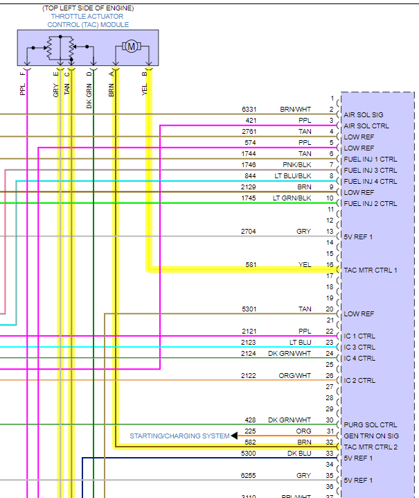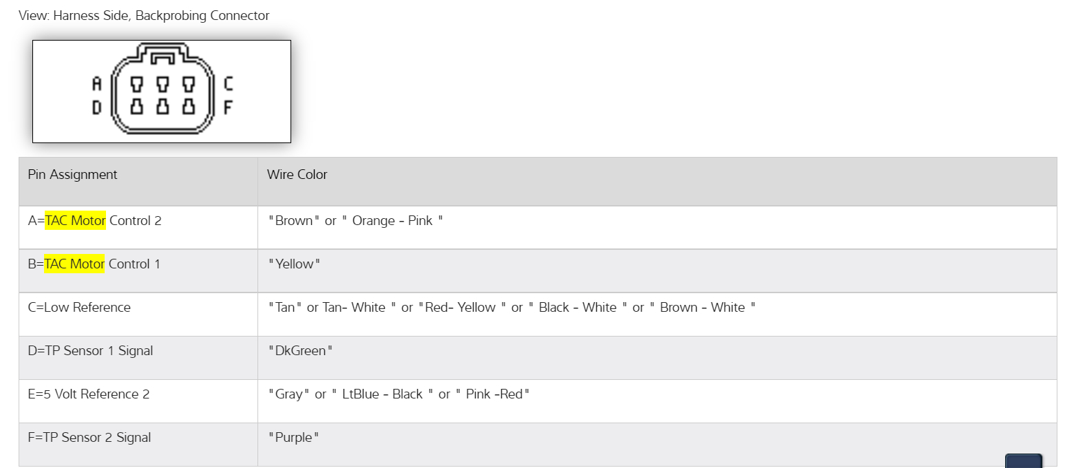 Checking the voltage to the throttle body is fairly easy, If you have a multimeter, you can back probe the connector at the throttle body. The grey wire is the 5-volt Reference feed wire, The purple and Dark Green wires are the Potentiometer signal wires going back to the ECM telling it how far open the throttle plates are. The Tan wire is the Ground. The brown and yellow wires control the motor for the throttle plates.