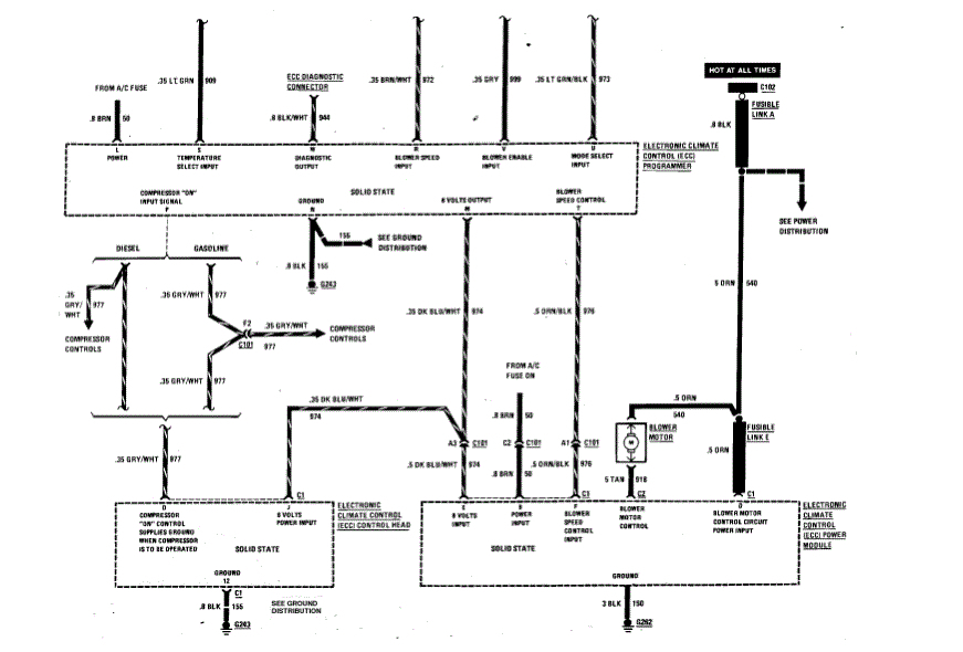 2. Jumper circuit 204 (pin A of the power module 2-way connector) to ground through a 5 amp in-line fuse. If the fuse does not blow within two minutes, the compressor clutch did not cause the power module failure (proceed to "Check the blower motor circuit").