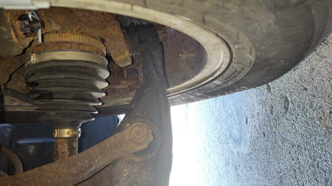 I checked the right side and there is no play. But when I dropped car and rolled back and forth in drive way the car rolled forward again. It's almost like it was bump steering. Just looking at at the ball joint and upper control you can tell there bad. Grease is coming out and boots are cracked. The strut assembly might be shot also . I'm just going to grab my old phone out it under car under each axle facing inward and outward and take 4 videos. That should help isolate where the issues are. I'm just not sure what do you think. Can a bad hub cause axle to bind and cause inner CV to jump and skip on intermediate shaft? Also one photo from past post you can see in front lower wheel well tire wore a groove into it. That is on the right side.