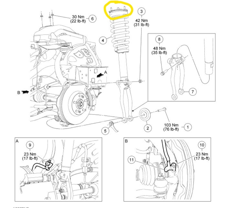 Yes, top strut mounts can make a clunk if they are worn. If the mounts are worn that amount you might want to look at quick struts, they include the strut, the mount and new springs all in one unit. They are much easier to deal with and even the OEM Ford parts are cheaper when bought as complete units than buying individual pieces. They are also not hard to change, you basically jack the vehicle up, put jack stands in place then remove the tires. Then place a jack under the steering knuckle and just take up a bit of weight. Then you loosen the pinch bolt (8) and remove the top three nuts (6). Next you lower the jack just a bit and I use a bar to spread the ears that the pinch bolt was clamping, then the strut pulls out of the fork and the bolts drop out of the top. To get more room it's not a bad idea to remove the speed sensor wiring and unbolt the caliper so that the wires and hoses don't stretch. Then you reverse the process to install the new parts.