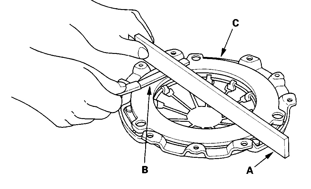 6. Inspect for warpage using a straight edge (A) and feeler gauge (B). Measure across the pressure plate (C). If the warpage is more than the service limit, replace the pressure plate.