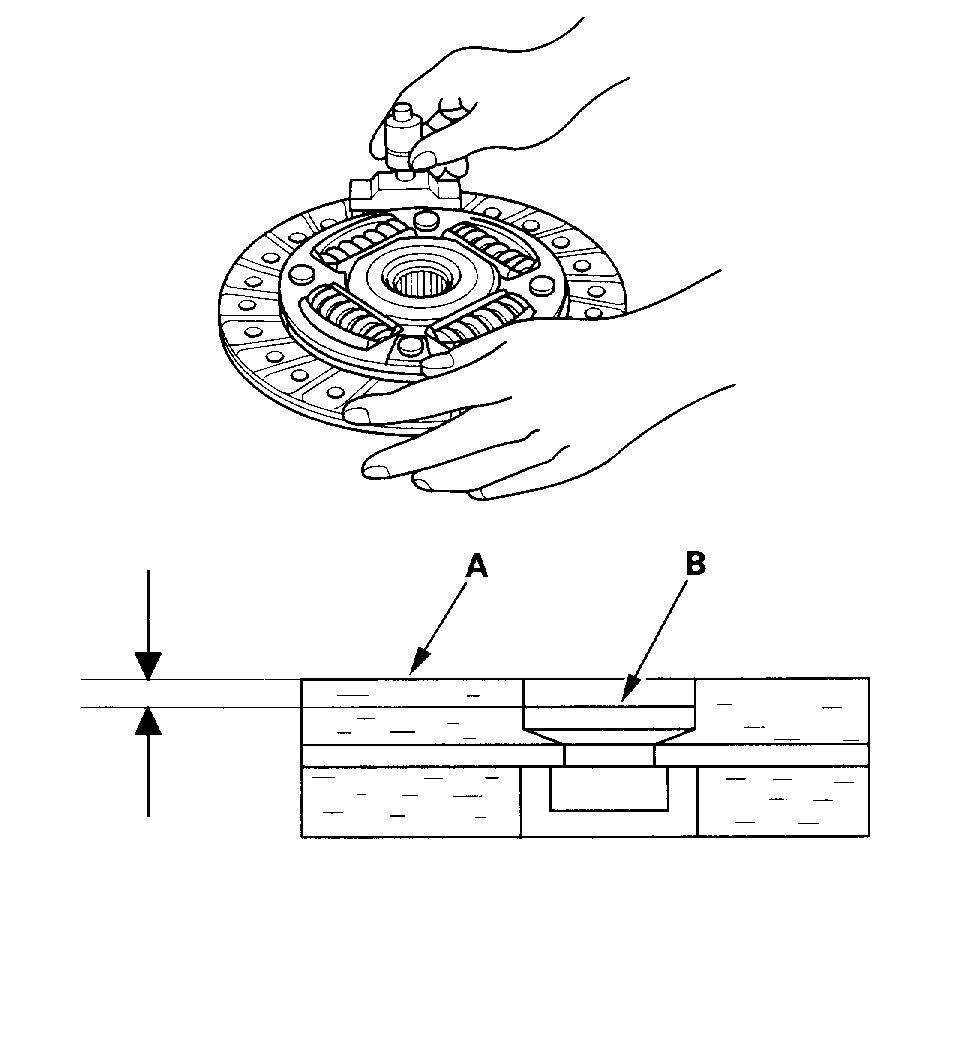 10. Measure the rivet depth from the clutch disc lining surface (A) to the rivets (B) on both sides. If the rivet depth is less than the service limit, replace the clutch disc.