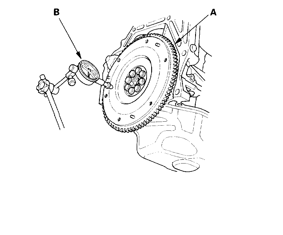 3. Measure the flywheel (A) runout using a dial indicator (B) through at least two full turns with the engine installed. Push against the flywheel each time you turn it to take up the crankshaft thrust washer clearance. If the runout is more than the service limit, replace the flywheel and recheck the runout. Resurfacing the flywheel is not recommended.