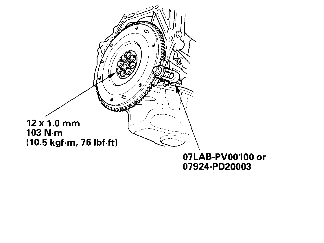 4. Install the special tool, then torque the flywheel mounting bolts in a crisscross pattern in several steps.