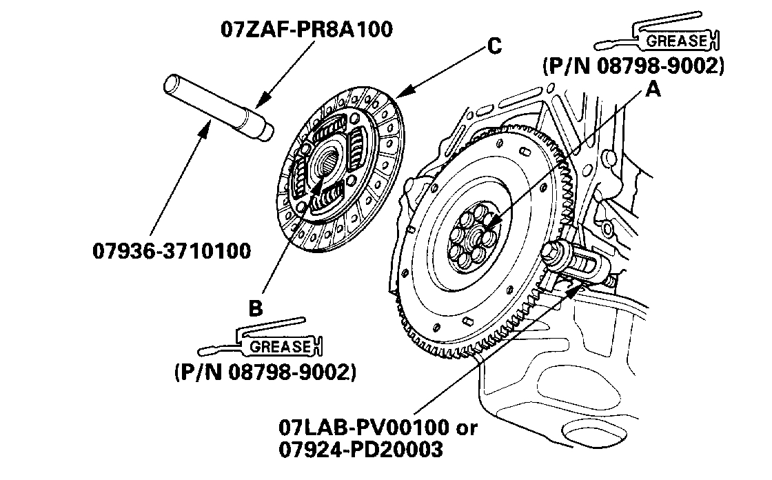 4. Apply super high temp urea grease (P/N 08798-9002) to the splines (B) of the clutch disc (C), then install the clutch disc using the special tools.