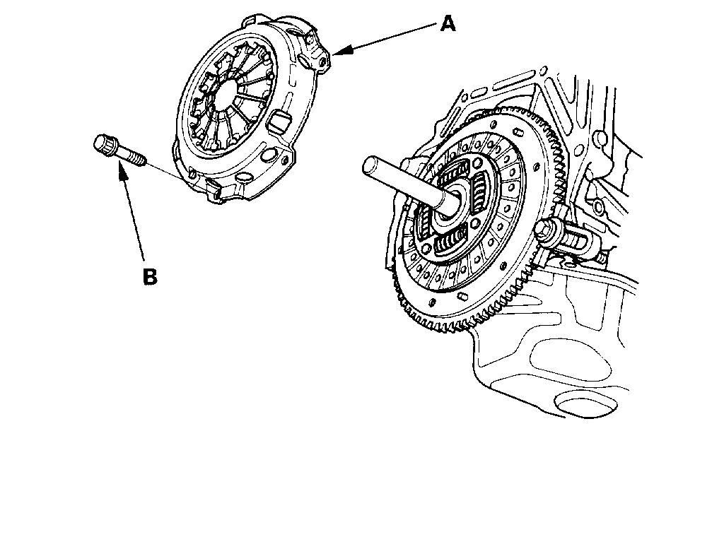 3. To prevent warping, unscrew the pressure plate mounting bolts (A) in a crisscross pattern in several steps, then remove the pressure plate (B).