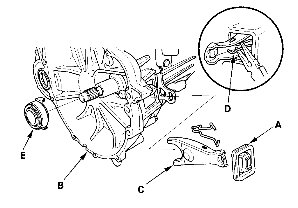 2. Remove the release fork (C) from the clutch housing (B) by squeezing the release fork set spring (D) with pliers. Remove the release bearing (E).