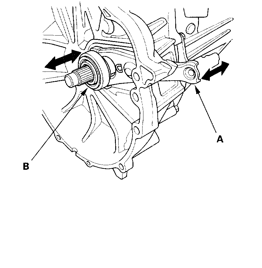8. Move the release fork (A) right and left to nuke sure that it fits properly against the release bearing (B) and that the release bearing slides smoothly.