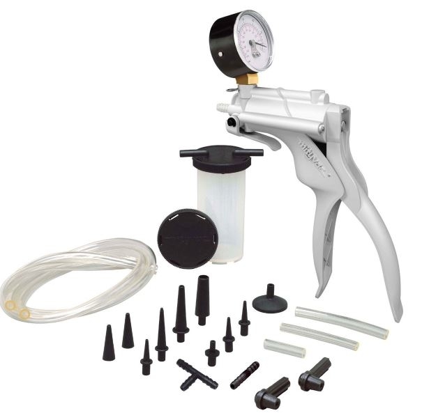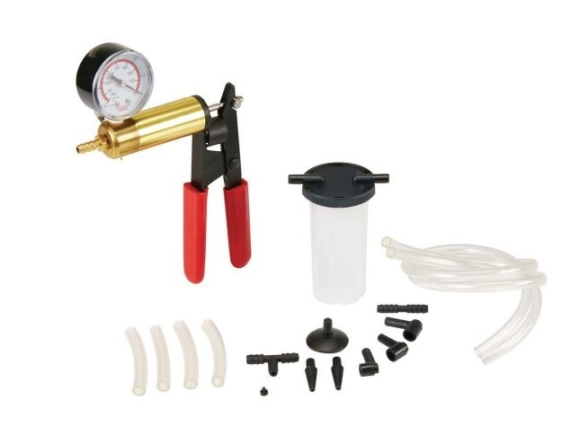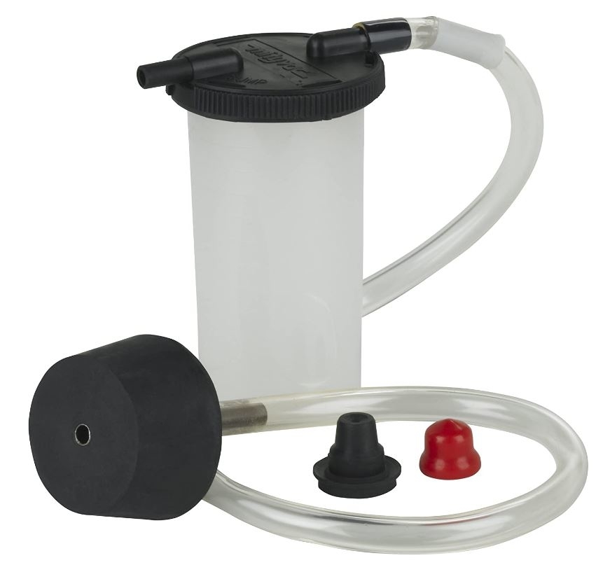 The J35555 is a standard hand vacuum pump, There are a few types out there. I prefer the metal versions but most of them will work just fine. The special adapter J 43485 is nothing real special, just a tapered rubber cone with a hole in the center to allow for a seal on the top of the master cylinder. A simple cheaper version is a common sink stopper with a small piece of tubing glued into it. Just like the expensive ones brake fluid will damage it, but the easy solution is to use it, then rinse it off with water and dry it.