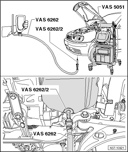 - With engine "running", install adapter for filling oil (VAS 6262/2) hand-tight.