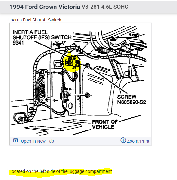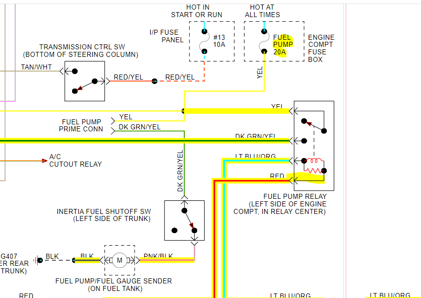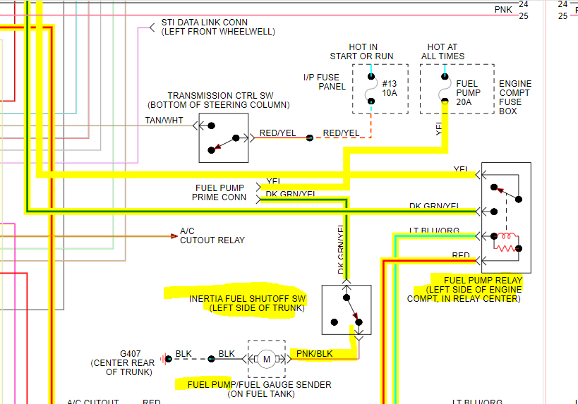 So, we need to start from square one. We know the power supply, a 20-amp fuse in the under-hood fuse box, is good and has power at all times. We know the inertia switch is good and reset. What I need to confirm is if the dark green wire with a yellow tracer has power when you first turn on the key. That is the power supply at the inertia switch. Check that and confirm for me, if there is power in, confirm power out from the inertia switch via the pink wire with a black tracer.