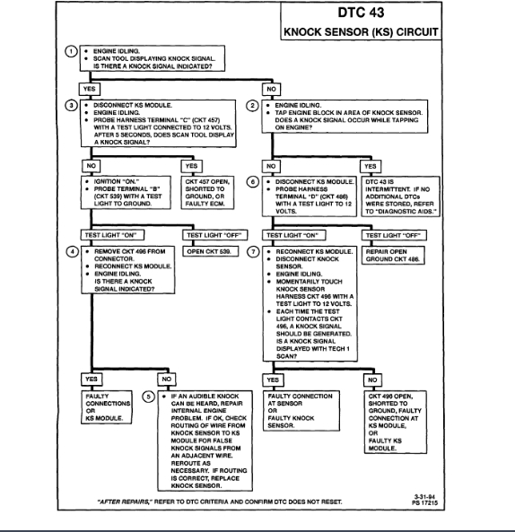 1. If the conditions for a DTC 43 are present, the Tech 1 scan tool will always display "YES." There should not be a knock at idle unless an internal engine problem, or a system problem exists.