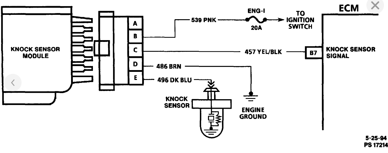 Knock Sensor (KS) system is accomplished with a module which sends a voltage signal to the ECM. As the KS detects engine knock, the voltage from the KS module to the KS drops, which in turn signals the ECM to retard timing. The ECM will retard the timing when knock is detected and rpm is above 900 rpm but less than 3800 rpm.