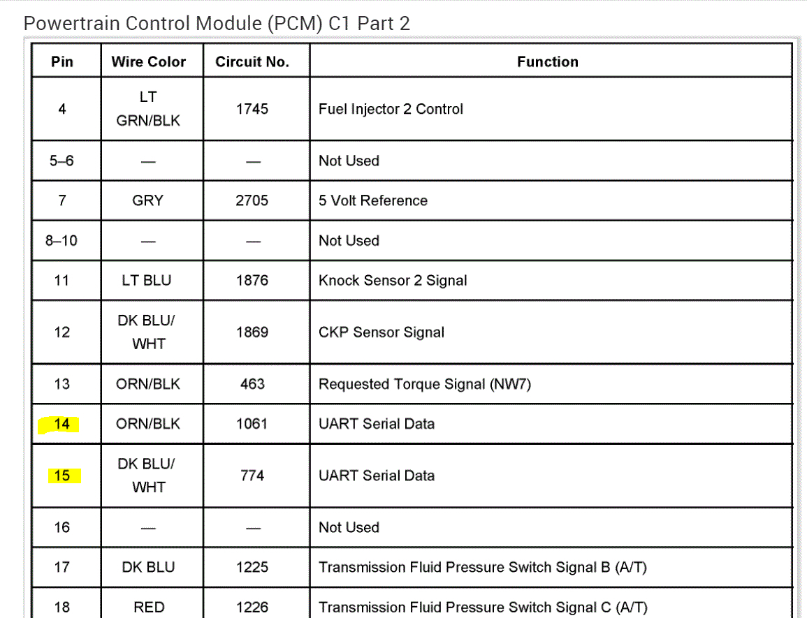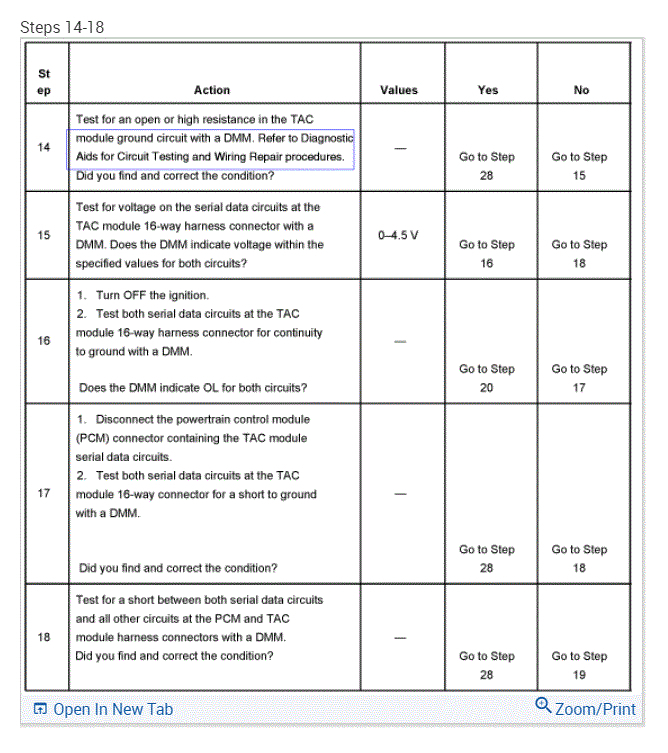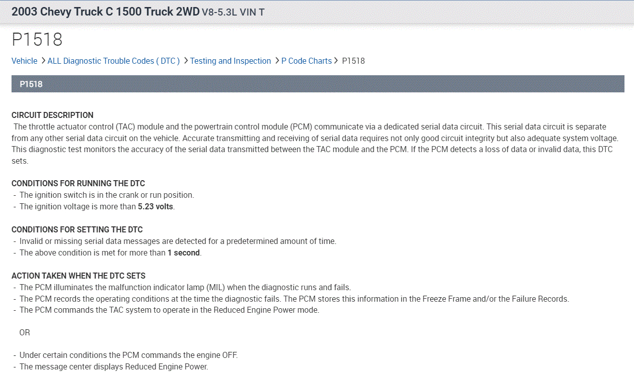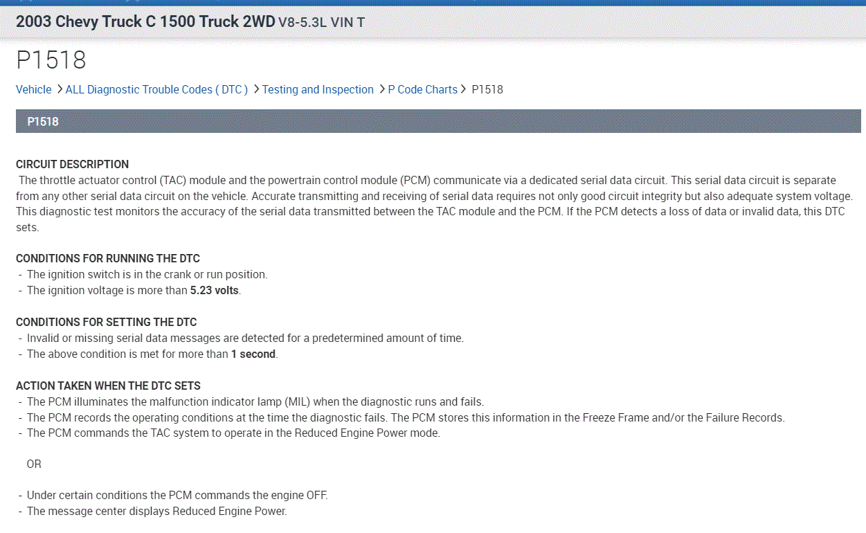 Hello, hope you had a good Christmas. Please bear with me this truck is a basket case. I have been doing this since 1980 and I can usually figure out can problems out, but this has got me stumped. i checked for grounds Ohomed the wires out between PCM and tac and between TPS and the tac and between the throttle petal actuator and the tac, had 5v reference at the 3 wires at throttle petal had 5v at tac module. I can clear all codes now and only p1518 is there, I can clear it too, but I have to do it twice. Engine will crank and run but throttle will not work, and engine will not turn off, I have been rewiring the wires out for days and I would like to know what the proper output at each wire going to the throttle body are supposed to be. Also, what is the voltage for serial is supposed to be coming off the PCM blue plug 14 and 15. This truck has been a problem. What am I missing? I have a blue driver, scanner and a Launch please point me in the right direction. Thanks