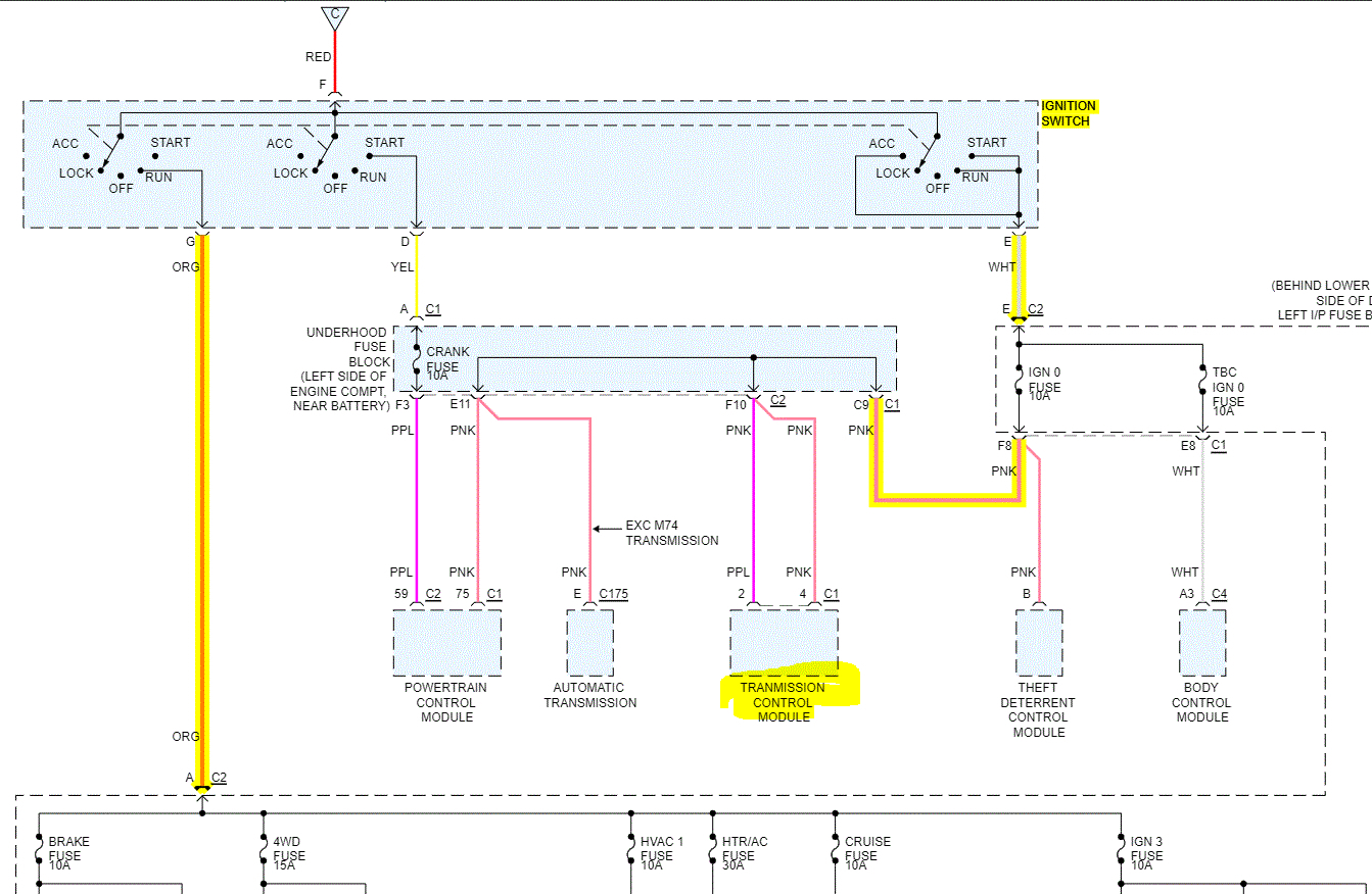 At the ignition switch, a white runs from the switch to the ignition 0 fuse. From there, it sends power to both the PCM and TCM. See pic 1 below. Check to see if there are any issues with power getting to its destination.