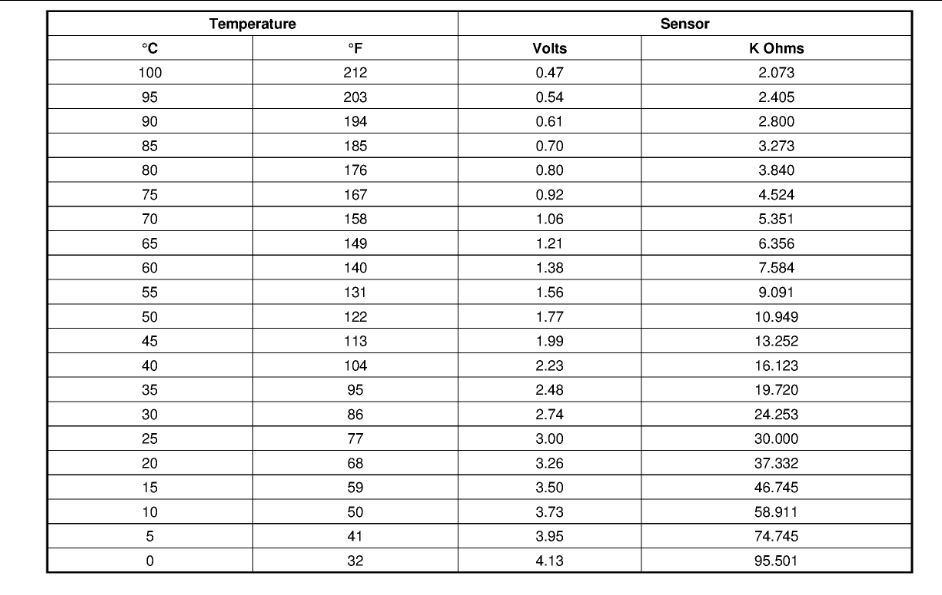 FRT SENSOR TEMPERATURE, VOLTAGE, AND RESISTANCE SPECIFICATIONS