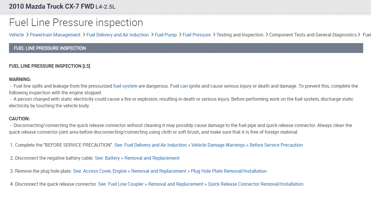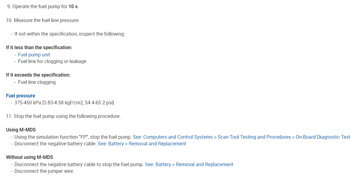 If you look below, it provides the directions specific to this vehicle for testing pressure and drop-off. Note: It provides two ways of doing it. One is with a scan tool that can communicate with the modules, and the other is without. I included both just in case.