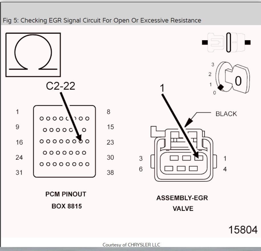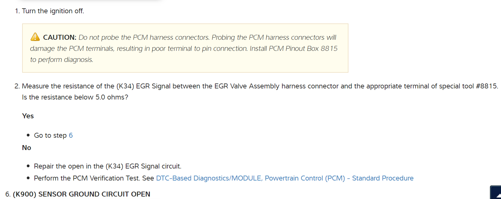 Also in the flowchart they talk about hooking up Pinout Box 8815. This is an expensive tool that is made for dealerships. There is another way to go about testing the PCM connectors. It is known as "Back Probing". You will need a couple of paper clips, metal only, to do this. Basically what you do is find the pin that the wire you are testing goes into the connector at. Instead of testing the front of the connector, you "back probe" the wire from the back, where the wire goes into the connector. Put a straightened paper clip in this cavity of the connector, it will contact the metal pin, and then hold your multi-meter's test probe to the paper clip for testing. This will prevent you from damaging the mating surface of the connector.