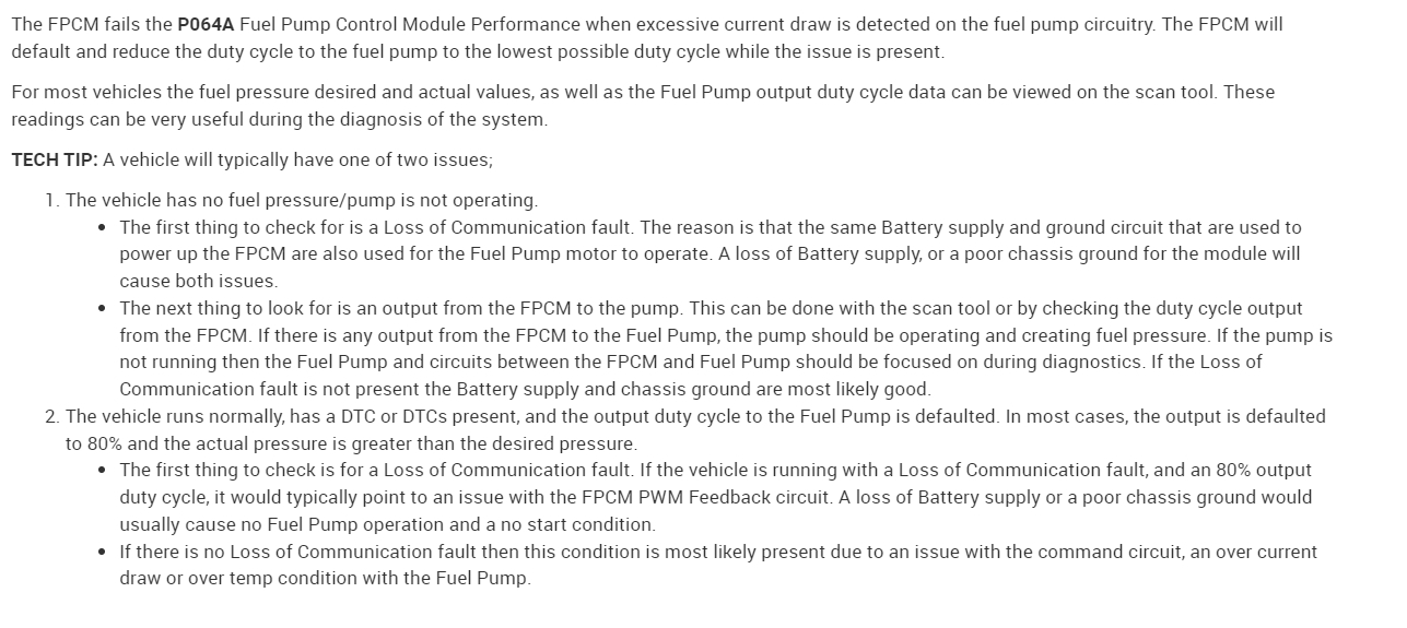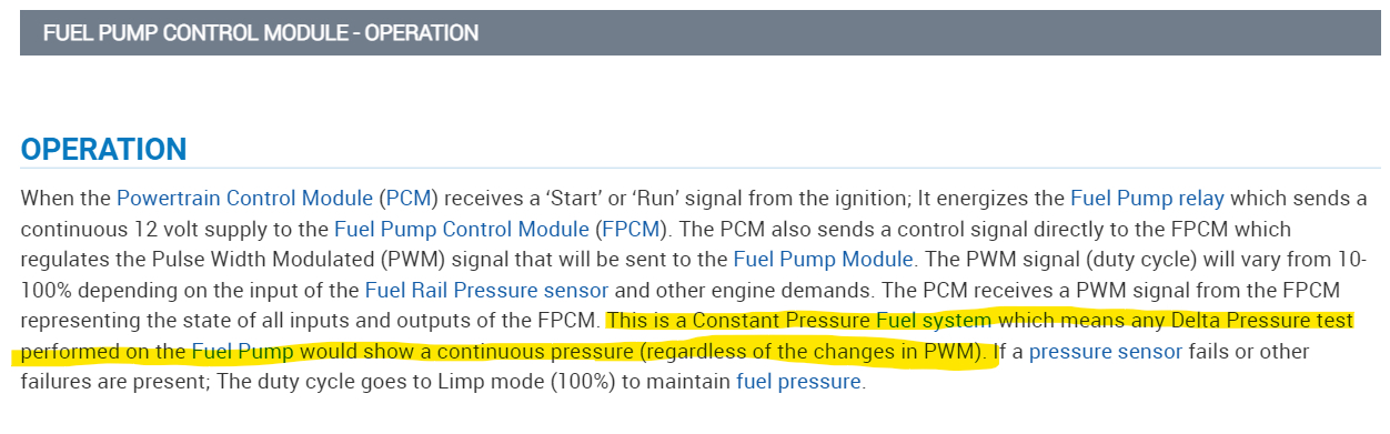 The purpose of having a separate fuel pump control module (FPCM) instead of a conventional system is to be able to have a variable fuel pump system to save on the electrical load put on the engine. They cause more problems than they solve though. There are other faults which can cause FPCM codes, things like a fuel rail pressure sensor, but there are a number of different codes for the module. Page 4 has a list of the most probable causes for that code. I went through all the information on the module and besides these 5 pages the rest was all based on other FPCM codes.