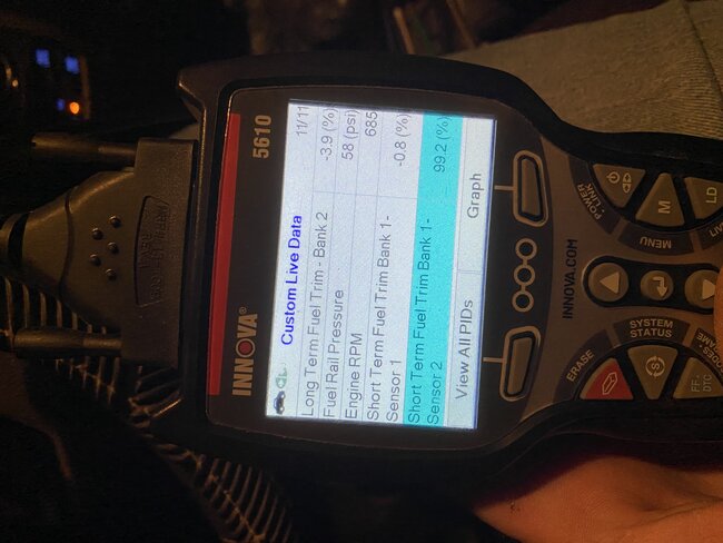 I'm not sure how much live data you can look at with your scan tool, most global obd2 scan tools can at least pull up live engine data, so if it can, take a look at anything to do with the fuel system. Any "Desired" and "Actual" readings, or the Long Term and Short-Term Fuel Trims. Take a look at the Fuel Rail Pressure sensor if you can.