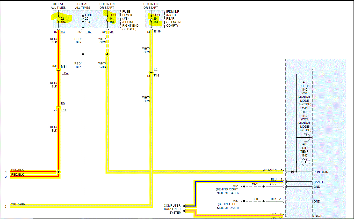 Pics 2-5 are of the TCM wiring. I highlighted CAN wiring and fuses I would like you to check. Also, I need to know if the starter is engaging. The next two pics show fuse locations. The last picture shows the wiring systems that could be related to the transmission. I need you to see if when the key is in the run position if the gear indicator is correct. It could be wiring from the range sensor which is indicated in the last pic.
