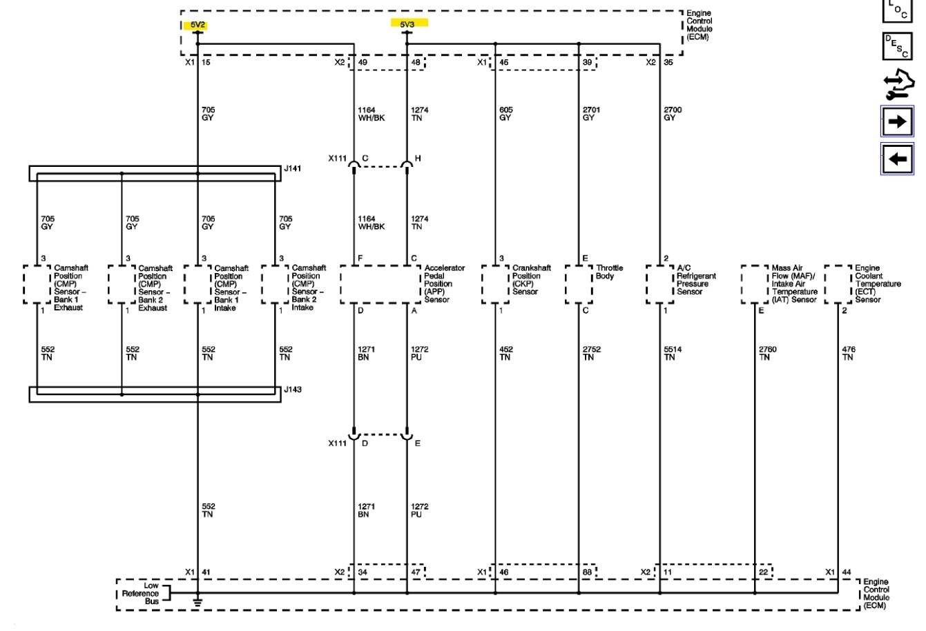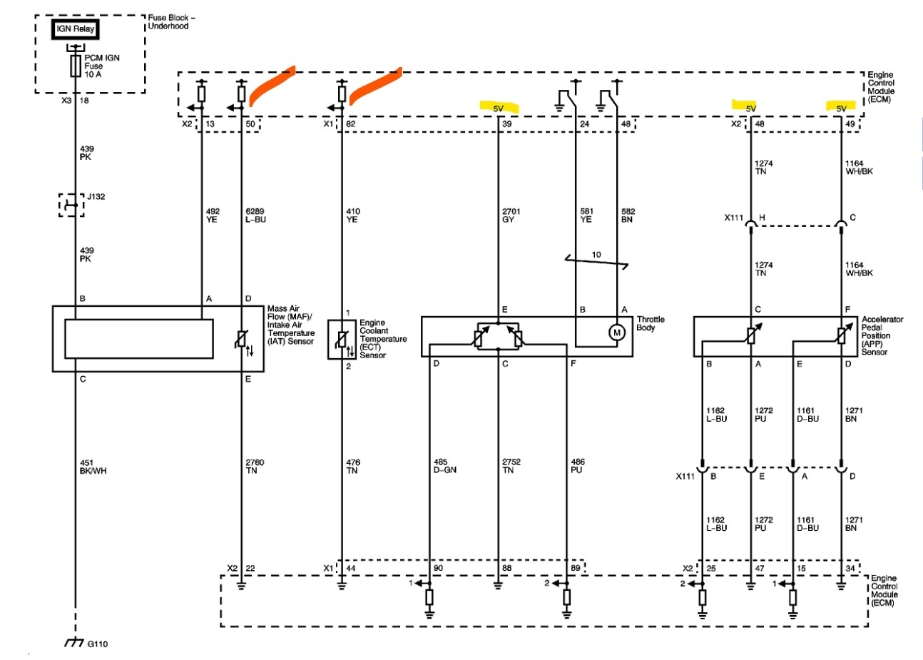 So, these are the OEM manufacturer diagrams of just the 5volt Reference circuits, you'll notice some are marked as 5vRef 1, 2, or 3, and in the first diagram it's just labelled 5v. Also in the first diagram where I put an orange slash, those sensors also use a 5volt reference, but since they are temperature sensors the 5volt feed is effected by the temperature of the sensor and that's how the PCM knows what temp they are reading, so to check these for 5 volts you would have to unplug the sensor, Thermistors (temperature sensors) are a bit more confusing to understand, so for now just concentrate on all the other sensors that use these reference voltages.