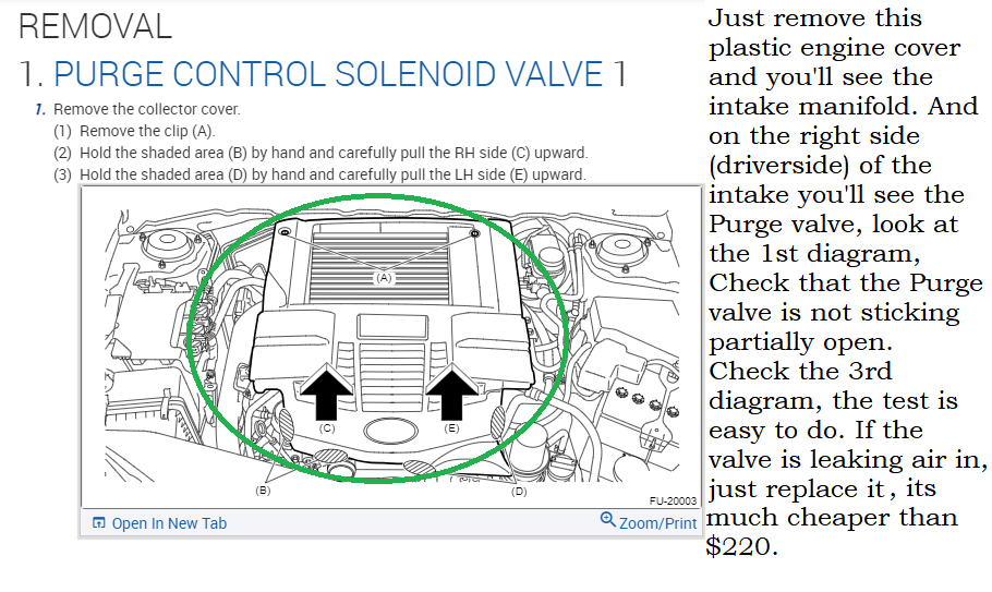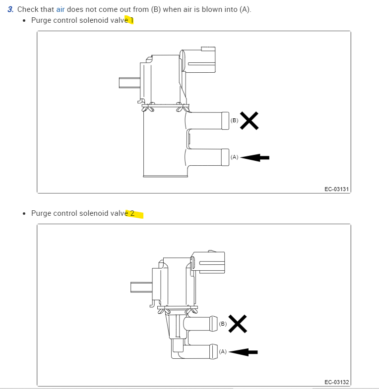 I'd like to know if one of them is sticking open, and if it has any charcoal from the Canister in it. I didn't not see many of these valves go bad in all the time I was there. We need to know if there is any charcoal in the valve, which means that the charcoal in the canister did get broken up somewhat and this can cause any new Purge valves to fail prematurely. So, if an overfill of the gas tank caused this, I think it did. It would be good to know, and this will help out future customers with this year Subaru. Since it is a more modern design.