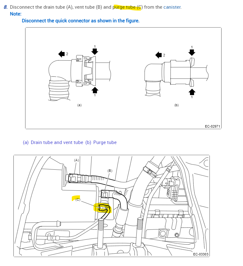If you can even get to the Canister, it is above the rear differential, you can see that the tube marked C goes to the Purge valve in the engine compartment, If you reach it and check for any gasoline coming out of the Canister from that point, then we know what is happening. Depending also if you're getting a lean code (P0171) or rich code (P2097).