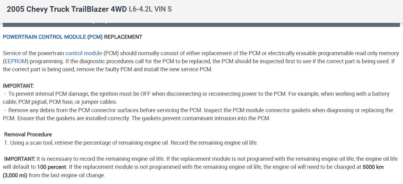 IMPORTANT: It is necessary to record the remaining engine oil life. If the replacement module is not programed with the remaining engine oil life, the engine oil life will default to 100 percent. If the replacement module is not programmed with the remaining engine oil life, the engine oil will need to be changed at 5000 km (3,000 mi) from the last engine oil change.