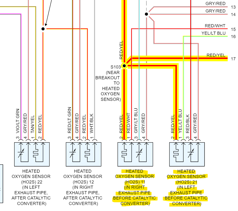 The diagrams 2 and 3 below are for the Oxygen sensor heater circuits that are setting the codes. The 3rd diagram is the same as the 2nd one it's just the manufacturer OEM diagram to verify the wiring colors were correct. The 3rd one also shows that there are a couple of connectors and splices in the wiring going to those sensors, so a corroded connector can cause issues like this as well.