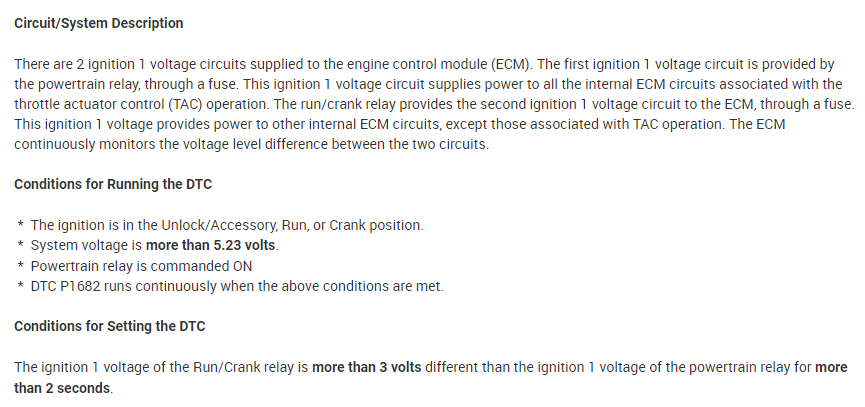 I've attached below the code information for both code P1682 and P0705. Code P1682 has to do with ignition voltage being supplied to the ECM-engine control module via a fuse controlling the throttle actuator control operation. Code P0705 has to deal with the transmission range selector and shifter operation. I've attached the code information below with picture diagnostic flowchart steps for your car. Get back to us with anything you find and we'll go from there. Hope this helps and thanks for using 2CarPros.