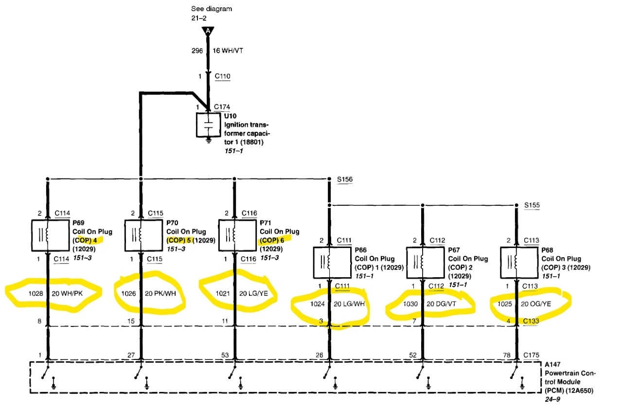 When changing out plugs and coil packs the guy pulled all the wires at the same time on 4,5 and 6 and put them back on wrong. I need the color code for the control wires to 4 5 and 6 so I can put them on the correct coils. The wires coming from the coil driver to cylinders 4,5 and 6 I need the colors of wires.