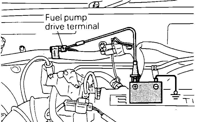 NOTE: At the completion of steps 5 thru 7, prior to turning the ignition off, disconnect the battery power to the fuel pump drive terminal. If the engine stops and no fuel pressure is observed, there is a problem in the power supply to the fuel pump.